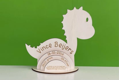 Houten dino met de gegevens van je kind is een perfect kado voor elke kleine dinosaurusliefhebber.